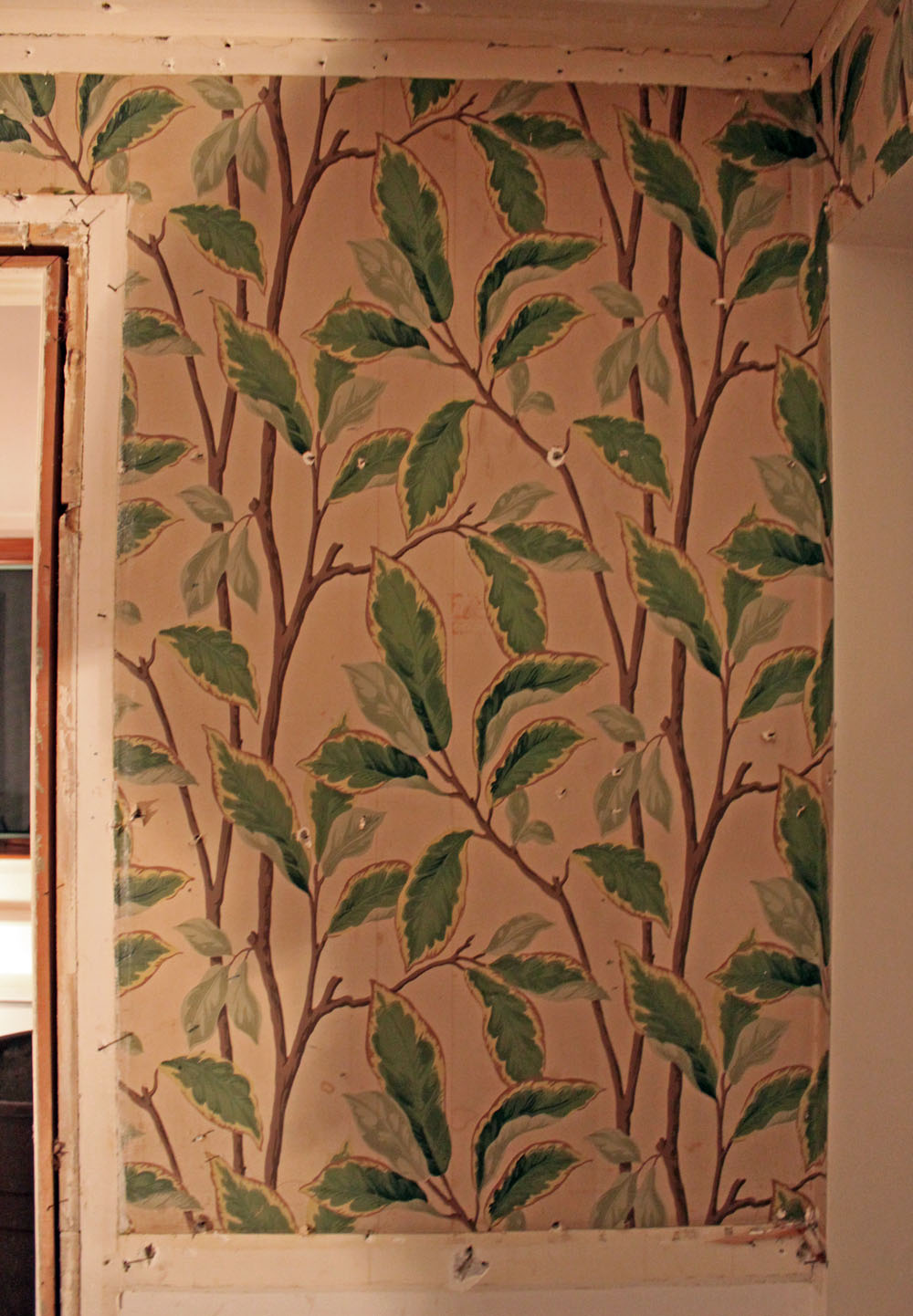 We found some amazing wallpaper behind the paneling it’s definitely original 1950’s banana leaf wallpaper!  Too bad it’s in top shape it would of been fabulous to try and save it at least in some section, at least it may serve as inspiration for the house warming party! How does a 1950’s ‘Before’ party sound?!  Leaves room for an ‘After’ party later me thinks!