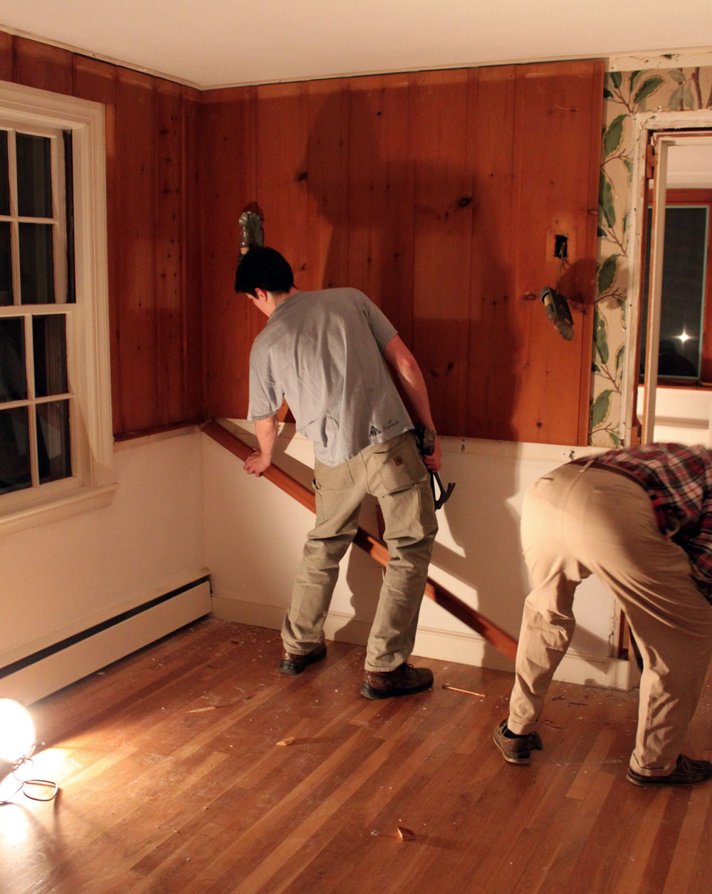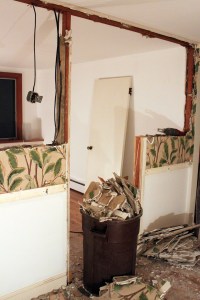 First thing to do decide what to take down and what to leave up. we take all of the paneling down in the dining room we have to disconnect the old fixtures, thermostat, chair rail then and decide how much of the walls to remove.