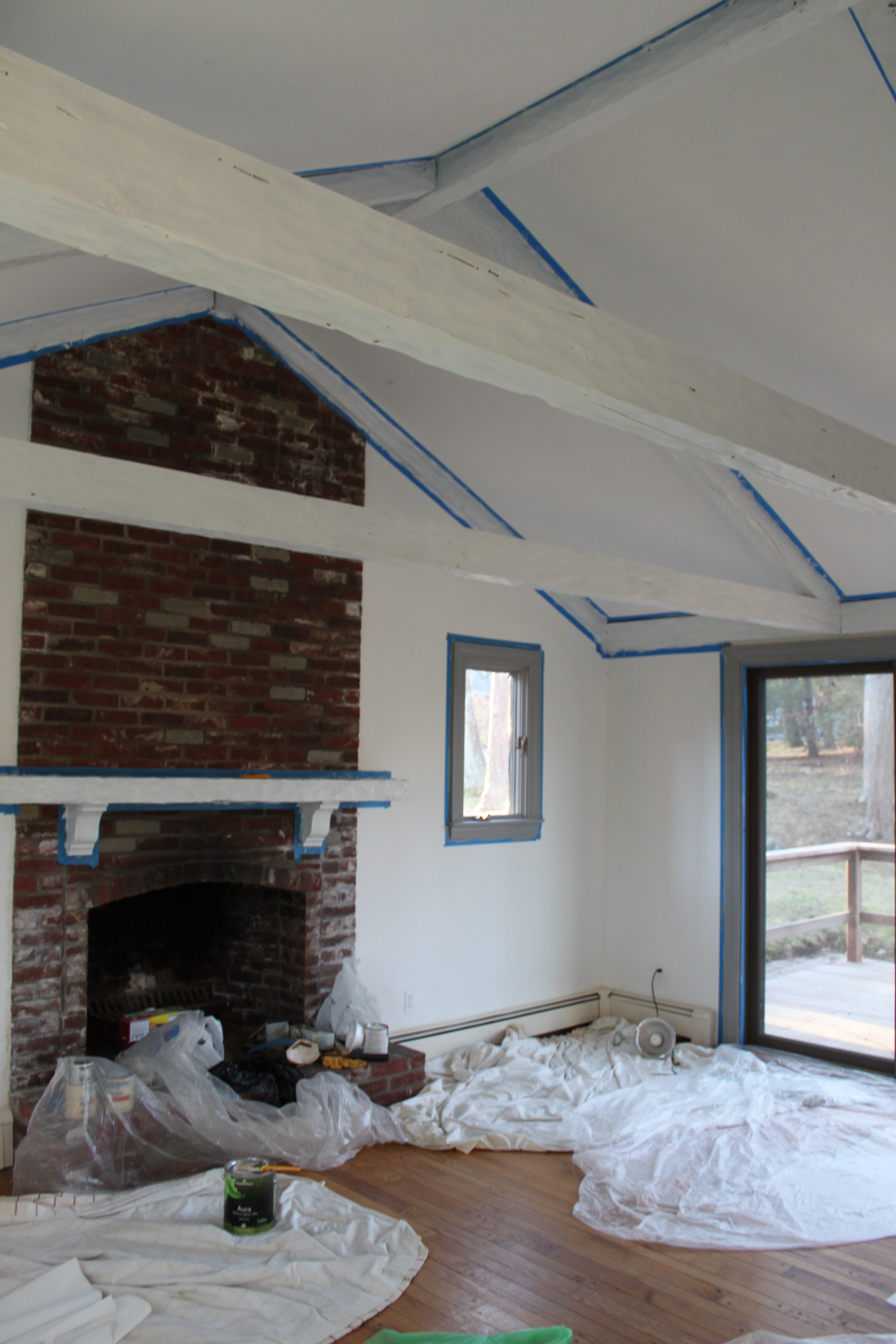 The hubs caulked all the seams around the beams to keep the drafts out, and I brushed the bricks down with a wire brush. I actually like the aged brick and the white residue adds a little more patina which actually looks great with the paint. By the way, we used a lot of primer to get that wood covered, and paint. I really looks so much bigger and lighter now, it’s just a perfect backdrop for our bedroom!