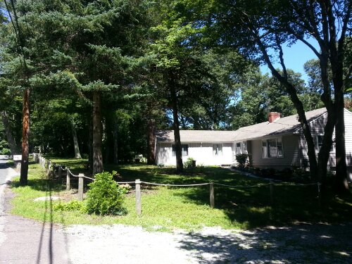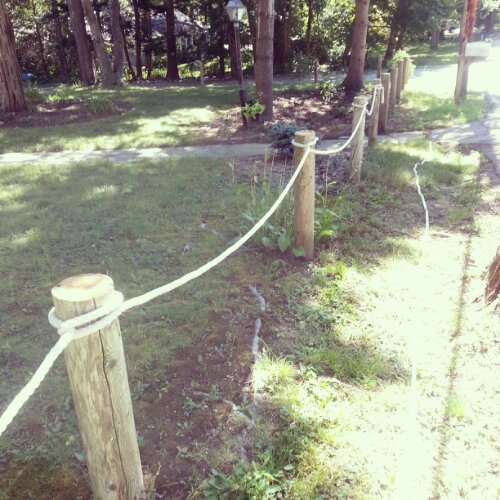 Last time I posted on our fence we had taken the stockade wall down last summer. (See Un-mending Fences) We left the wood posts remaing in hopes we could reuse them and carted off the stockades for a later project. Our neighbors were thrillled and also curious as to what we were leaving the posts in for. It took a while, but we finally got to finishing it. I thought it would be open, economical abd appropriate to the area to do a rope fence.