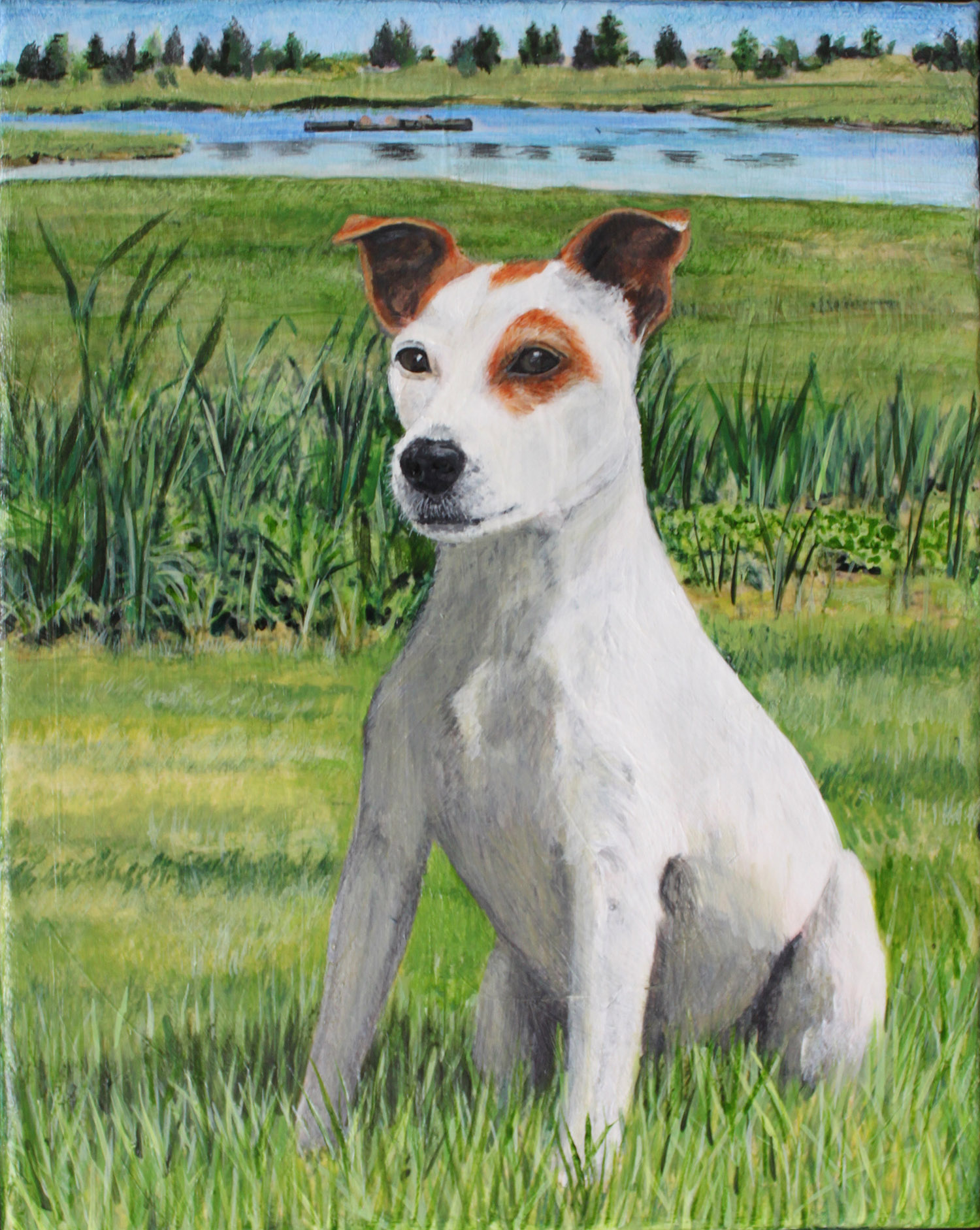 The final composition was a combination of 2 shots from the photo session and one of the owners pre-existing. The painting is an 8″x10″, about as small as go for a full figure, anything smaller and it just doesn’t have the presence and personality when hung.