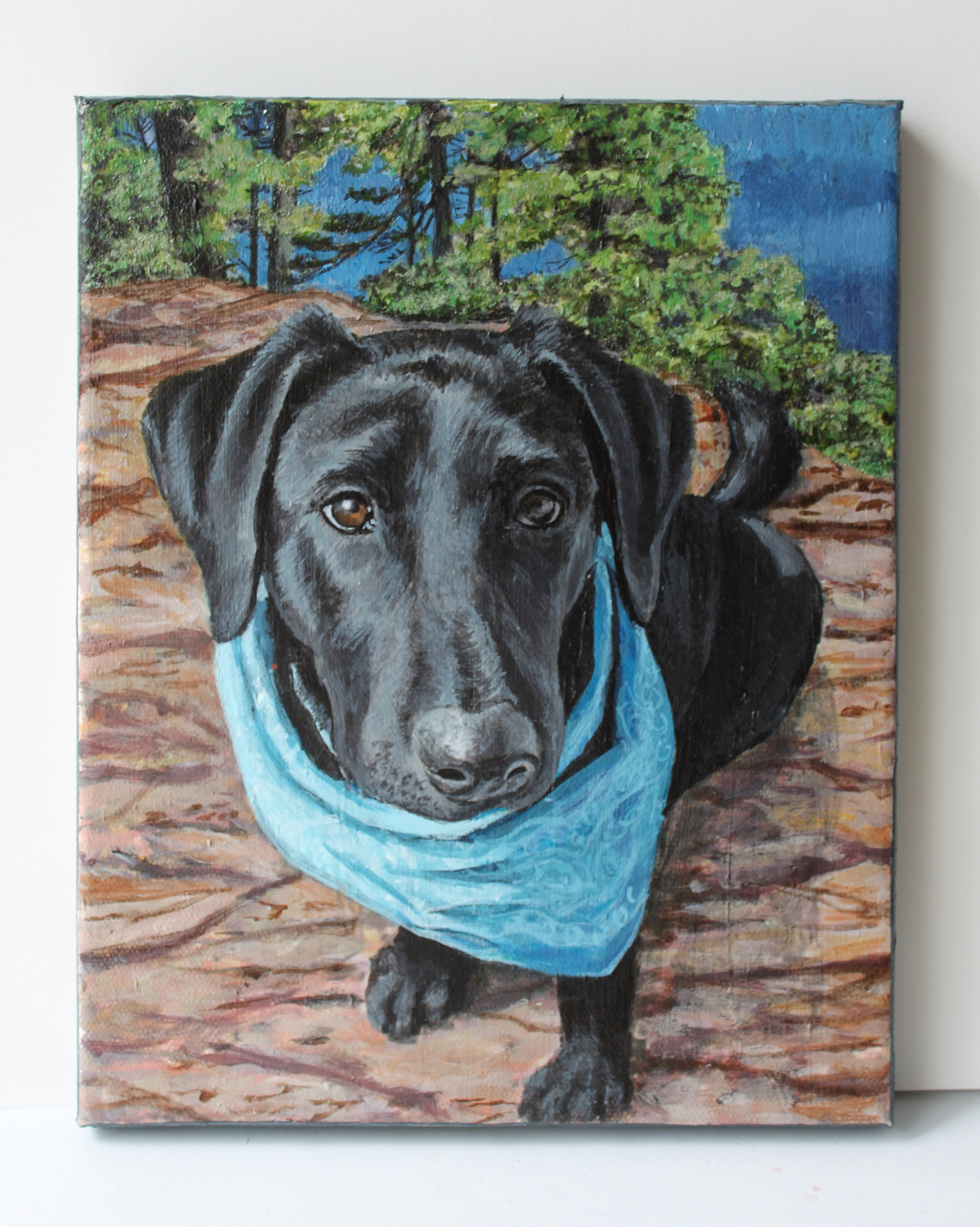 ‘Kenya’ is 8×10″ acrylic on canvas. It was important to the client to have a setting that felt like Colorado, so we worked that in from some other shots that she had on file. Because it is a small canvas, I recommended the tighter composition so we wouldn’t loose any of Kenya’s personality.